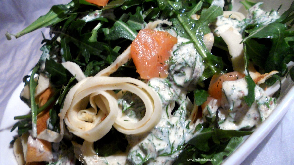 Салат с копченой семгой, авокадо и блинчиками