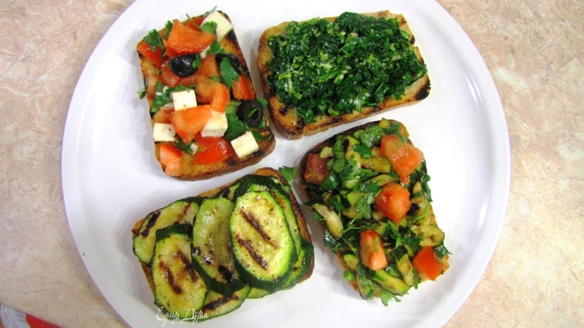 Кабачок с помидором и зеленью Данная начинка делается очень легко. Порубите соломкой готовый запеченный на гриле кабачок. Порубите маленький помидор. Порубите базилик. Смешайте все. Сбрызните чайной ложкой бальзамического уксуса. Посолите, поперчите, сбрызните оливковым маслом Extra Virgin. Положите на кростини и слегка вдавите. - Шаг 15Важно! Не используйте слишком ароматный хлеб, иначе он забьет вкус и запах от остальных ингредиентов. Используйте в данном случае масло только Extra Virgin. Запах дыма, чеснок, запах самого хлеба и оливковое масло дают непередаваемый аромат кростини. Вы его никогда не забудете Я использовал в салате оливки, хотя лично мне данный салат больше нравится без оливок. Попробуйте оба варианта. Если при зажаривании хлеба у вас он выгибается (жарятся только края), положите сверху тарелку. Лично я так делаю. Но, соответственно на сковороде, а не настоящем гриле. Очень важно слегка вдавить начинку в тост, чтобы соки пропитали его.