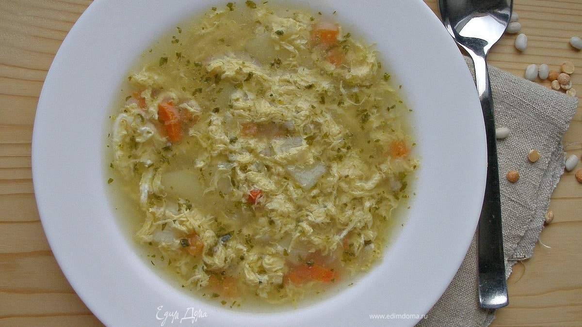 Яйца слега взбить. Помешивая суп по кругу, тонкой струей вливать яйца в воронку. Приправить зеленью и сразу же подавать:)