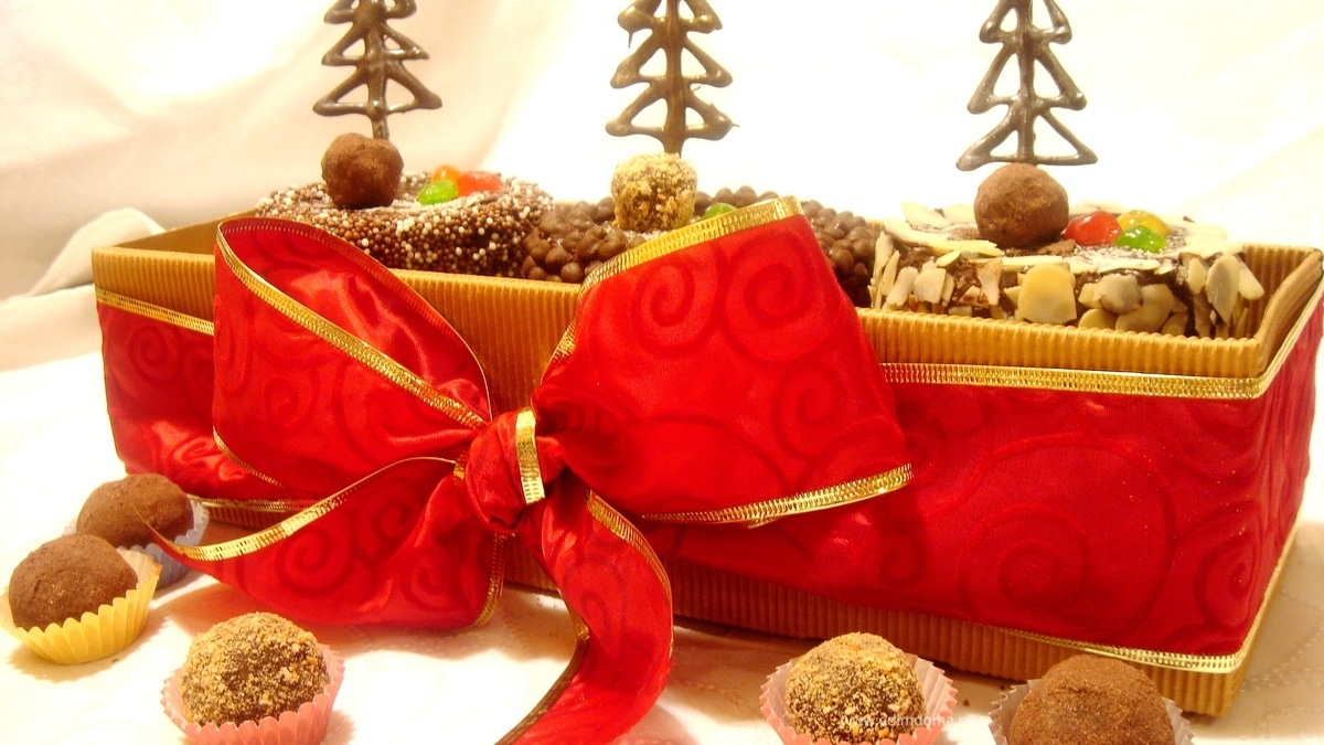 Обсыпать края пирожного миндальной крошкой или вафельной крошкой или шоколадными каплями.Ножом сделать прокол в пирожном и вставить в него ёлочку.Украсить пирожное засахаренными фруктами и конфетами,охладить.Оставшиеся конфеты переложить в специальные розеточки и подать отдельно.За час до подачи достать пирожное и конфеты из холодильника.Приятного новогоднего чаепития!
