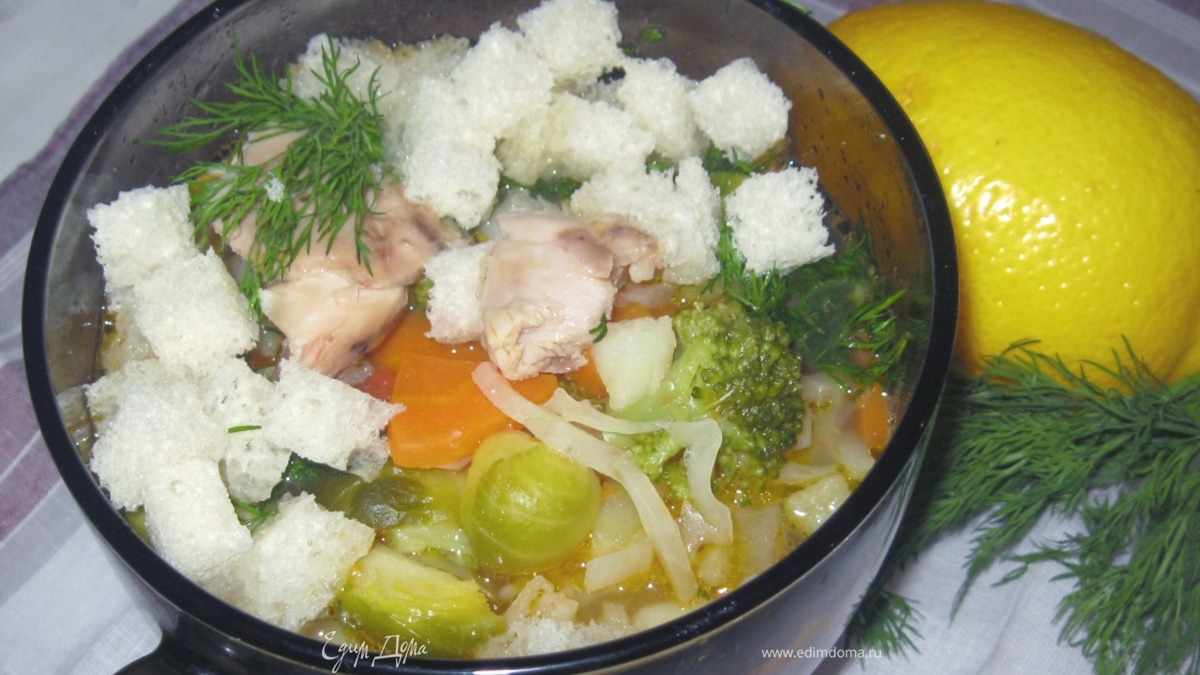 - Шаг 1В небольшую мисочку выдавил пару столовых ложек лимонного сока, добавил пол чайной ложки цедры, щепотку сахара и, перемешав, оставил настаиваться. Куриное бедрышко залил пол литром холодной воды, положил небольшую луковицу, разрезанную пополам, морковку и подсолил. Вместо лаврушки, положил чайную ложку шалфея и столько же девясила, завернув их в кусочек марли. Поставил на плиту, а когда вода начала закипать, убавил огонь до среднего. Так, бульон должен варится, не менее получаса. У меня есть время, я оставил на час. Что бы он не выпарился, накрыл крышкой, оставив небольшую щелку. За это время нарезал соломкой картофелину и промыл ее холодной водой. Нашинковал листик белокочанной капусты. Разморозил и порезал брокколи и брюссельскую капусту. Вместо них можно взять любые зеленые овощи. Например стручковую фасоль или шпинат, потому что они нужны для того что бы придать супу аппетитный вид. Сваренный бульон процедил через ситечко. Бедрышко большое жирное. Бульон получился наваристый и, несмотря на то, что я не снимал пенку, прозрачный. Положил в него картошку и поставил вариться, а через пять минут добавил белокочанную капусту и крупно нарезанную морковь. Мороженые овощи варятся быстро, поэтому их положил, когда картошка почти сварилась. Подождал пару минут и выключил огонь. В суповую чашку с горячим супом добавил чайную ложку лимонного сока и перемешал. С бедрышка снял шкурку, срезал мясо и положил в чашку, нарезав небольшими кусочками. Белый хлеб у меня уже начал черстветь, поэтому я нарезал его кубиками и посыпал ими суп. Ну и, конечно же, не мог обойтись без укропа. Суп получился ароматным и аппетитным. Ложка лимонного сока не сделала его кислым, за то добавила витамина С. Маменька, обычно, ругает мои блюда, но, в этот раз, похвалила. Правда сказала, что не хватает петрушки. Ничего, овощной ларек рядом, сбегаю.
