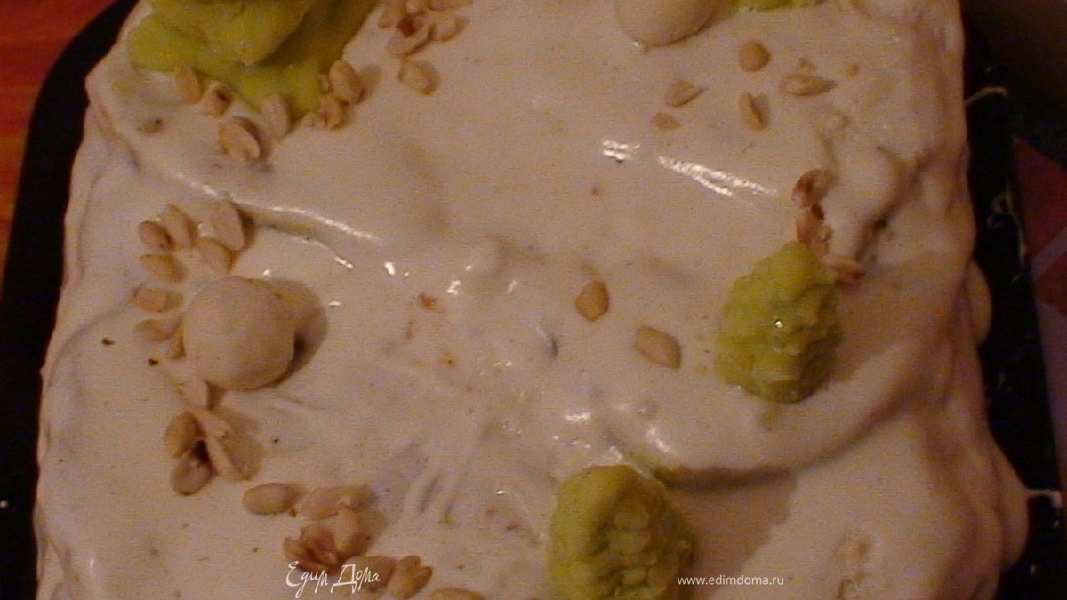 Взбиваем сметану с полстаканом сахара и разрезаем корж белый и смазываем кремом. Далее на смазанный корж выкладываем порезанный дольками киви (не очень тонко, чтобы чувствувалась кислинка) и кладем произвольно по всему коржу. Далее накладываем другим коржом и также смазываем кремом и посыпаем орешками. - Шаг 3Далее фантазируем. Я резала корж в форме дуги и клала наверх смазанных коржей и смазывала кремом. Далее тот же корж с маком резала немного меньшей дугой и клала наверх. А теперь делаем горку. Делала первый раз маршмееллоу своими руками как описала Люссия ссылка на рецепт и пожалев миксер недоделала маршмеллоу и получилось пышный и воздушный зефир. Ну что же делать, а я придумала стояло это чудо у меня на балконе около 2месяцев и ничего с ним не случилось. Так я так званый зефир розогрела в микроволновке и просто намазывала на торт. вот и получилось такое воспроизведение! Всех с зимой и новым 2012 годом!!!! Будьте счастливы!!!