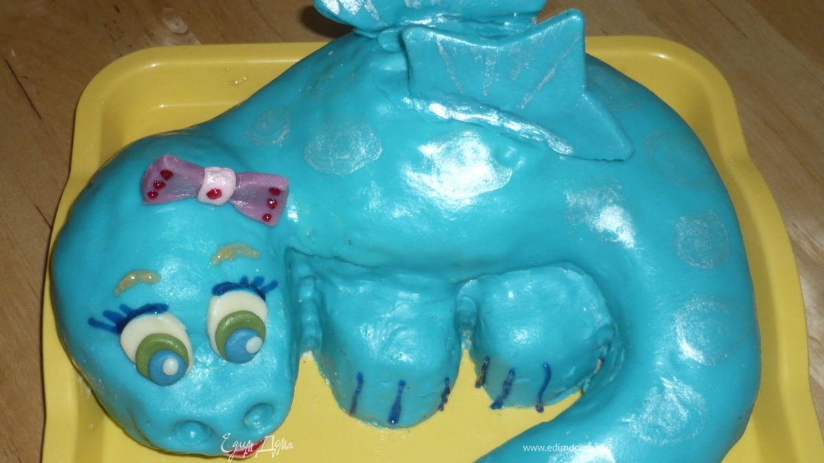 Украсить нашего дракончика - выдавить ноздри, глазки сделать из овальчиков белой, зеленой и синей мастики, вылепить бантик, сделать язычок из розовой мастики, прилепить крылья - я вырезала из из большой формочки для печенья - звезды, потом я пробежалась серебристым кандурином по дракончику, гелевыми пищевыми фломастерами нарисовала ресницы, брови и кое-где нанесла последние штрихи. Торт-Дракон готов!
