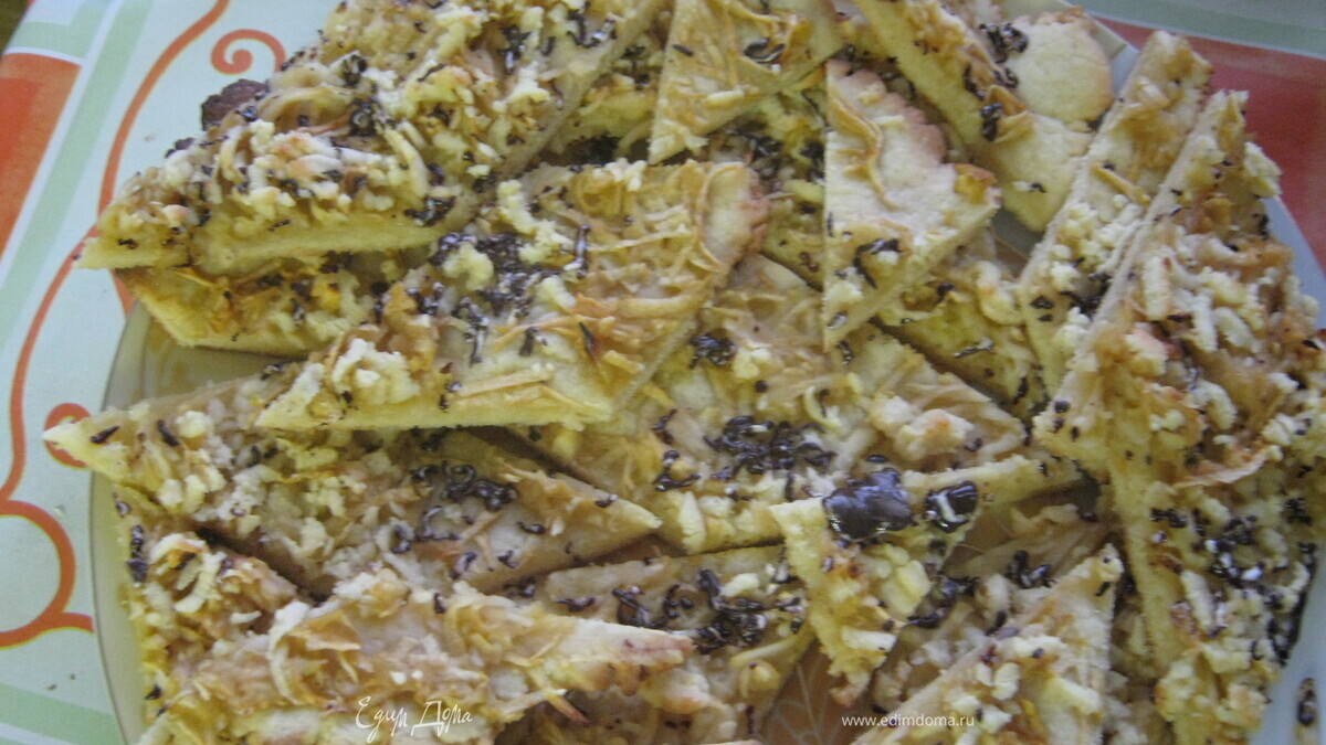 - Шаг 6Готовый корж ещё горячим разрезать на квадраты или ромбы. Посыпать шоколадом.