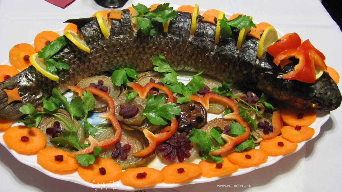 - Шаг 1Пеленгас помыть, вынуть внутриности. Посолить, поперчить. Сделать надрезы до хребта и вставить туда полукольца лимона. На смазанный противень выложить полукольца лука и на него нашу рыбку. Выпекать при температуре 180 градусов 20-30 минут. Немного остудить, выложить на блюдо и украсить.