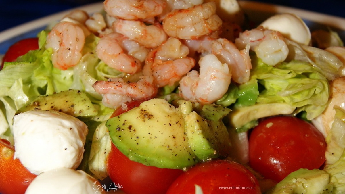 - Шаг 1На сковородку наливаем оливкового масла, добавляем крупно порезанный чеснок для того, чтоб он отдал маслу свой вкус, затем чеснок убираем. Высыпаем предварительно размороженные и почищенные креветки, обжариваем на сковородке 3 минуты. Чистим авокадо, нарезаем на дольки, сбрызгиваем лимонным соком, чтоб оно не потемнело и немного перцем. На тарелку выкладываем салат айсберг, половинки помидоров черри, немного солим, затем беби моцареллу, авокадо, сверху выкладываем креветки, сбрызгиваем оливковым маслом и бальзамических уксусом. Приятного апетита!!