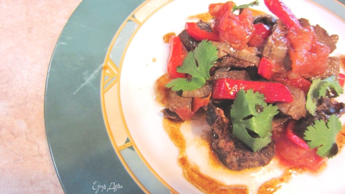 В разогретую сковороду плесните масла для жарки (у меня это рафинированное подсолнечное масло). Обжарьте лук на среднем огне в течение пары минут, слегка помешивая. Лук не должен полностью обжариться. Плесните на лук чайную ложку бальзамического уксуса. Перемешайте и жарьте еще пару минут. Выложите мясо к луку. Хорошо перемешайте и нагрейте смесь в течение пары минут. Не забудьте посолить. Мясо уже должно быть нормально посолено. Выложите мясо в глубокий противень, специальное блюдо или порционные сковородки (как это обычно делают в кафе). Сверху выложите помидоры и перец и полейте ложкой оливкового масла. Слегка посолите и поперчите сверху блюдо.