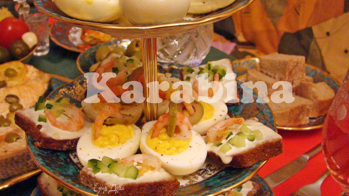 Яйца разрезаем пополам. Аккуратно вынимаем желток. Отдельно смешиваем желток с майонезом и горчицей (ориентируйтесь на Ваш вкус). С помощью кулинарного шприца (или просто ложкой) заполните белок начинкой. Оливки нарежьте кольцами. В каждое колечко просуньте креветку и украсьте фаршированное яйцо.