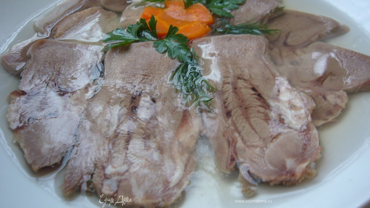 Язык варить 2 часа,с луком,перцем,лавровым листом.Солить в конце варки.Вытащить язык и ополоснуть холодной водой,так он лучше чиститься.Почистить от шкурки. Желатин замочить водой,оставить набухнуть и залить 1.5 ст воды-нагреть до его растворения. Язык нарезать,уложить в тарелку,залить желатином,украсить зеленью и варёной морковкой.и поставить в холодильник на несколько часов,до застывания.