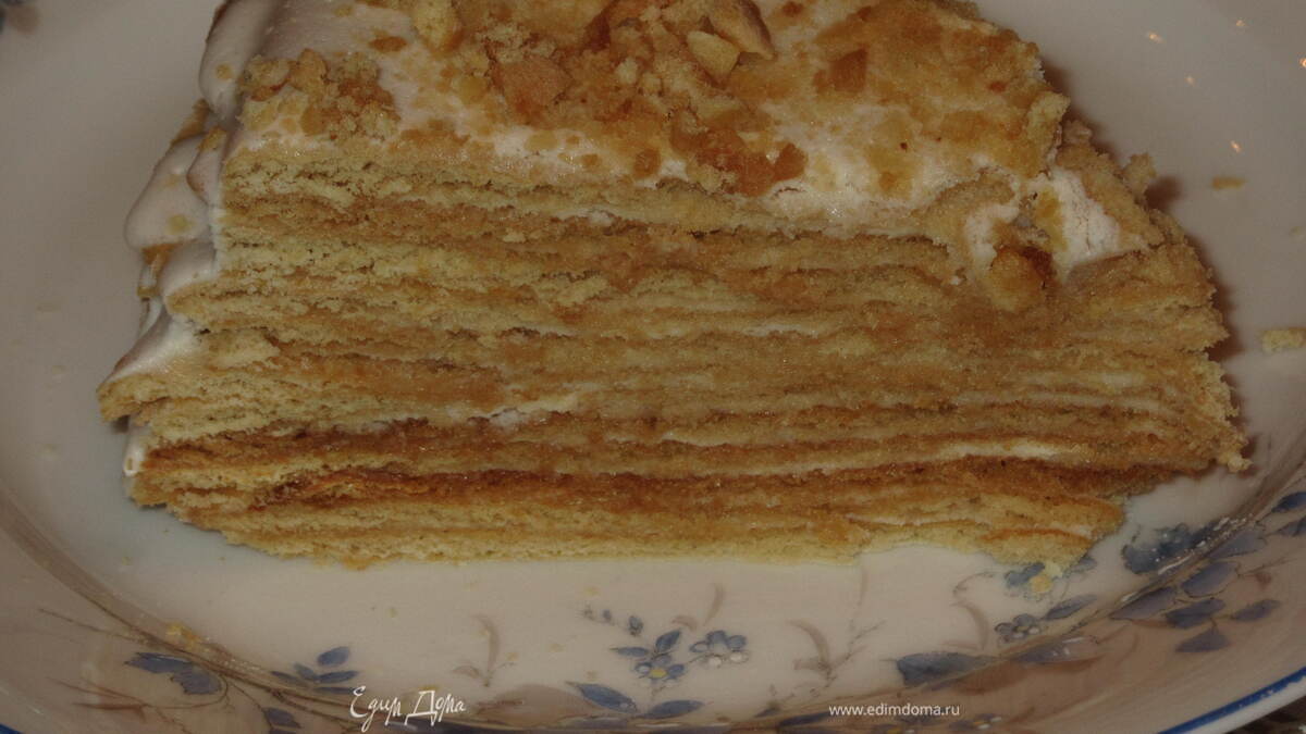 - Шаг 5Промазать коржи кремом, сверху посыпать крошкой от обрезки коржей и дать ночь настоятся. Приятного чаепития!