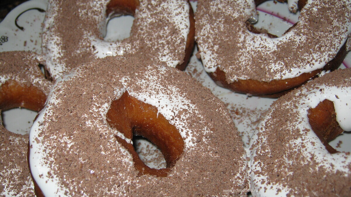 - Шаг 1Дрожжи растереть с 1 чайной ложкой сахара, добавить теплого молока, примерно треть муки и поставить подходить. Подошедшую опару соединить с взбитым с сахаром яйцом, размягченным сливочным маслом и оставшейся мукой (муки может уйти больше, смотря, сколько возьмет тесто). Месить тесто до тех пор, пока оно не начнет отставать от стенок посуды. Накрыть полотенцем и поставить в теплое место на 20-30 минут. Затем раскатать тесто в пласт толщиной 0,5 см. Стаканом или формочкой вырезать кружки и выдавить по серединке еще одну дырочку формочкой по меньше. И оставить их минут на 15 для расстойки.Я жарила пончики во фритюре. Разогреть масло до температуры 175-180 градусов, класть в него одновременно по 4-5 пончиков и жарить до желтовато-коричневого цвета. Готовые пончики вынуть и положить на бумажное полотенце, чтоб пропитать лишний жир. Белок взбить с сахаром до густой массы, покрыть наши пончики и сверху притрусить тертым шоколадом. Приятного аппетита!