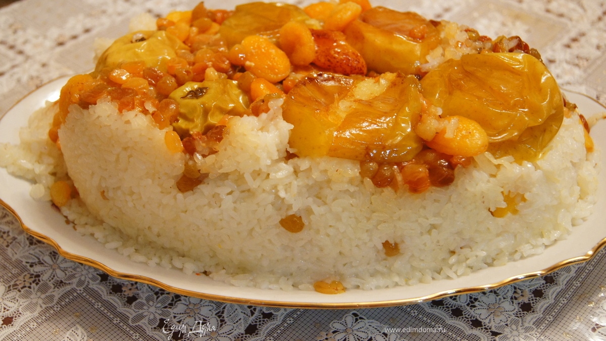 Берем кастрюлю с толстым дном или казан. С яблок срезать шляпки сделать небольшие углубления ножом и положить в них по 0,5 ч.ложки сахара и кусочку сливочного масла. Уложить их на дно казана. Сухофрукты залить кипятком дать настояться. Рассыпать по яблокам. Рис отварить до полу готовности в подсоленной воде, влить воду и перемешать с сахаром по вкусу. Разделить на 2 части. Масло сливочное 100г. раскрошить на сухофрукты и яблоки, потом положить рис одну часть. Распределить по кастрюле и на него раскрошить еще 150г. масла потом накрываем второй частью риса и раскрошить оставшимся маслом. Поставить на очень медленный огонь томиться на примерно 2часа( Проверить ложкой яблоки должны пропечься).Перевернуть на блюдо, фрукты окажутся на верху. Приятного аппетита с Рождеством!