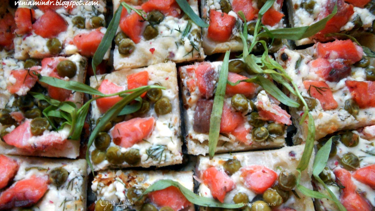 Поверх выложить рыбу и зеленый горошек (в идеале замороженный (предварительно разморозить), но у меня оказался только консервированный - и с ним, конечно, неплохо, но не столь душевно). Выпекать в предварительно разогретой духовке до готовности (15-20 минут). В горячем виде тесто будет казаться влажным, из-за маскарпоне, поэтому нужно дать остыть, после чего нарезать порционно и подавать.