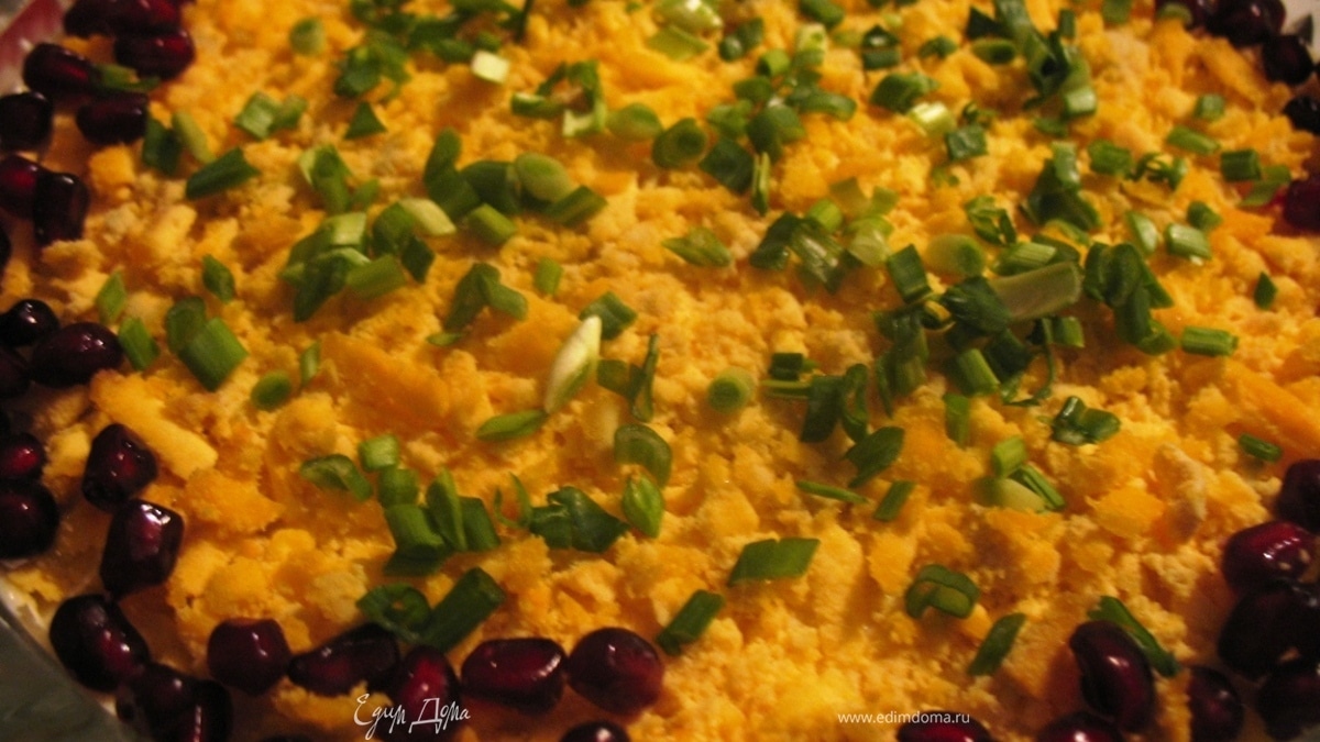 - ПодготовкаПриготовление: 1 слой – белки натертые на терке; 2 слой – рыба, раздавленная вилкой; хорошо смазать майонезом ; 3 слой – лук мелко нарезанный; 4 слой – яблоки, натертые на терке ( они погасят лук ); 5 слой – сыр натертый на терке; хорошо смазать майонезом ; 6 слой – сливочное масло натертое на терке; хорошо смазать майонезом ; 7 слой – желтки натертые на терке. Сверху украсить веточками петрушки.