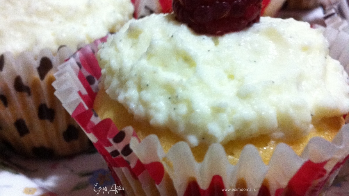 Дайте кексам остыть, положите на них крем и сверху украсьте ягодами малины. Для темных капкейков можно подготовить шоколадную крошку и украсить ей ванильный крем.