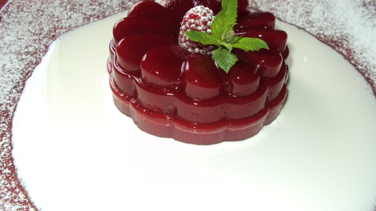 - Шаг 2В сливки добавить пудру, перемешать и вылить на блюдо, вынуть желе из формы и положить по центру. Украсить малиной и мятой.