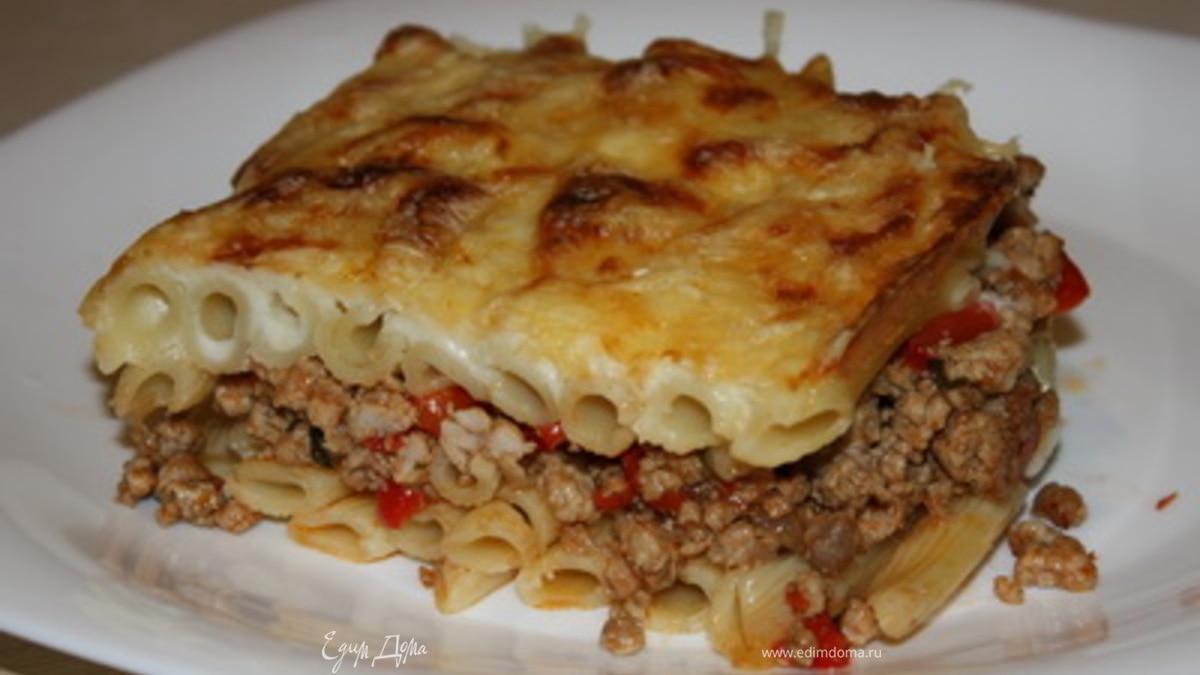 - Шаг 1Лук мелко режем и обжариваем в течение 3 минут на растительном масле. Добавляем фарш, соли, перчим и жарим 10 минут, постоянно помешивая. Вливаем вино, продолжаем жарить еще минуты 3, пока жидкость не выпарится. Добавляем в сковороду мелко нарезанный перец, тушим 5 минут. Бросаем к мясу мелко нарубленную петрушку и томатную пасту, перемешиваем и тушим 4 минуты. Макароны отвариваем, сливаем воду, затем добавляем 0,5 ст.л. оливкового масла и перемешиваем. Готовим соус. Для этого растапливаем в кастрюльке сливочное масло, добавляем муку и размешиваем до однородности. Постепенно, непрерывно помешивая, вливаем молоко и доводим смесь до кипения. Снимаем с огня. Собираем запеканку. На дно формы (у меня 35*24 см) кладем половину макарон. Далее кладем фарш, разравниваем. Накрываем оставшимися макаронами. Сверху равномерно распределяем соус. Посыпаем тертым сыром и запекаем в разогретой до 200 градусов духовке в течение 25 минут.
