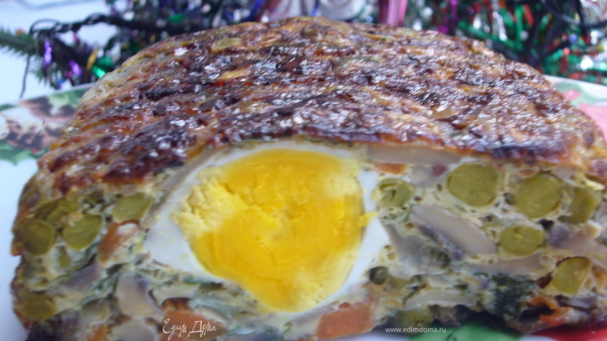 грибы почистить и нарезать на дольки.Морковь и лук на кубики.Всё вместе обжарить немного на масле.Добавить куриное филе(мелко нарезанное), мелко нарезанную зелень ,горошек и взбитые 6 яиц ,приправленые солью и перцем. Прямоугольную форму смажь маслом и выложи пергамент.Выложи половину смеси и сверху разбей 3 сырых яйца.Выложи остальную смесь и накрой бумагой чтоб не пригорело.В разогретую духовку на 45 мин./до образования корочки:)Вытащить и можно подавать в тёлом и холодном виде.