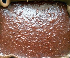 Форму (здесь 25х27) застелить бумагой, слегка смазать маслом. Выложить тесто, разровнять. Выпекать в предварительно разогретой до 170С+- духовке, 20 минут +-. Главная задача не пересушить - брауни должен оставаться слегка влажным, с кремообразной текстурой, тесто должно "пружинить".