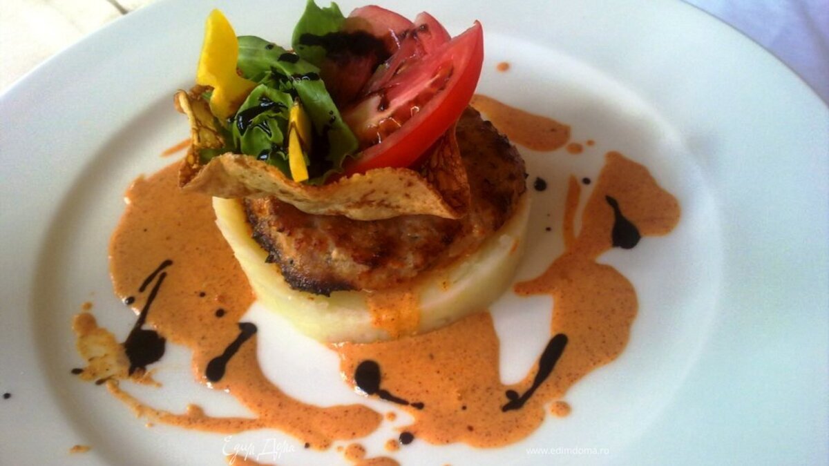 - ПодготовкаГотовим фарш. Жарим котлеты. Отвариваем картофель, готовим пюре. Режем овощи на салат. Жарим блинчики на маленькой сковородке, снимаем и заворачиваем кроя, делаем вазочку. На красивую тарелку выкладываем картофельное пюре с помощью формы для печенья, сверху кладем котлету и блинчик в блинчик кладем овощной салат и поливаем подливой и соевым соусам.