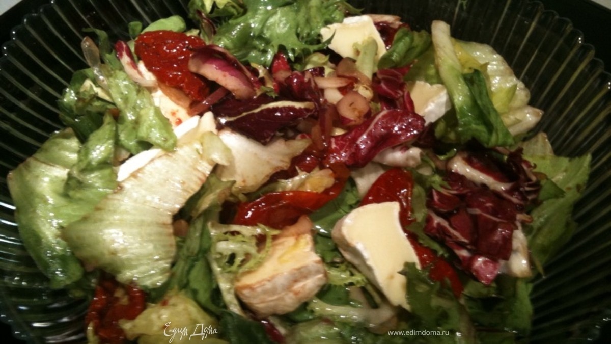 Смешать микс салатов с луком и вялеными помидорами. Залиить заправкой, вымешать щипцами или руками. Добавить сыр и еще раз перемешать. Сразу же подавать к столу. Приятного аппетита!