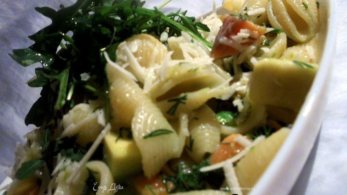 Паста с маринованной семгой, авокадо и руколой