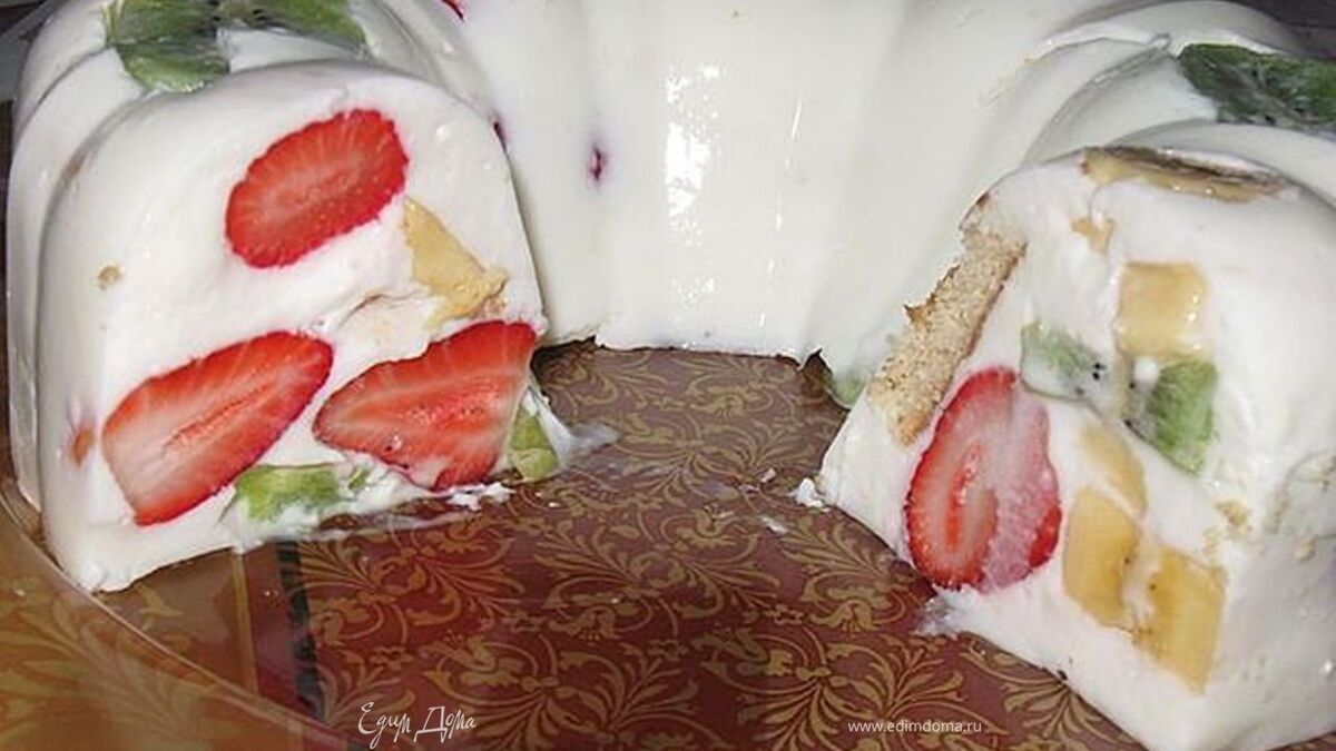 - Шаг 1Желатин залила стаканом молока на 30 минут. В это время сметану и торожную массу взбила с сахаром . По прошествии 30 мин.подогрела желатин до полного растворения Ввела желатин в сметанно-творожную массу тоненькой струйкой постоянно помешивая. Пользовалась силиконовой формой, на дно выложила ягоды клубники , киви и бананы, затем слой поломанного на кусочки бисквита, опять слой ягод и слой бисквита. Залила сметанно- творожной смесью и убрала в холодильник на 3 часа. По прошествии 3-х часов достала тортик из холодильника и аккуратно перевернула на блюдо.