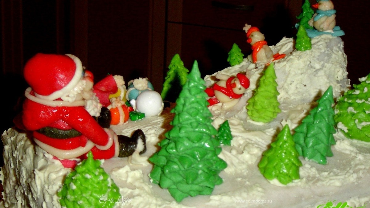 Я заранее вылепила фигурки снеговиков, Санты, подарки, мешок, елки, снежинки и теперь осталось только воплотить в жизнь свою задумку по украшению торта. Я покажу как я это делала. - Шаг 16