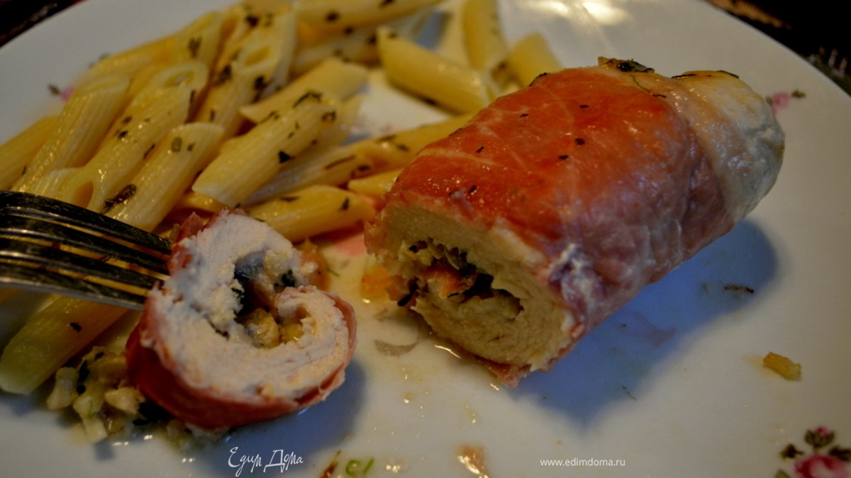 На кусок ветчины положить отбитую куриную грудку или, наоборот, на куриную грудку положить ветчину, сверху пару ложек рисово-творожной начинки и свернуть все в рулетик. Перевязать шелковой ниткой или скрепить, проколов зубочисткой.