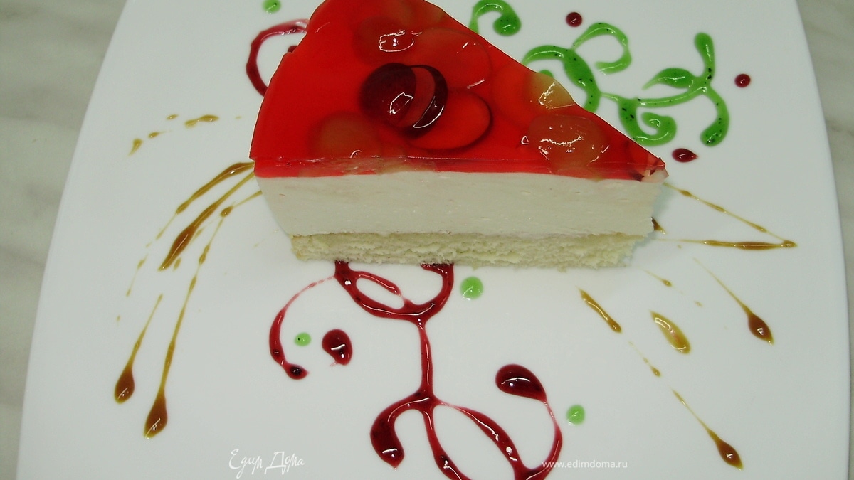 Ввести сливки в творожную смесь и всё перемешать. Выложить получившуюся массу поверх бисквита и разровнять. Поставить охлаждать в холодильник на30 мин. Помыть и нарезать виноград. Разложить по поверхности застывшего чизкейка. - Шаг 8
