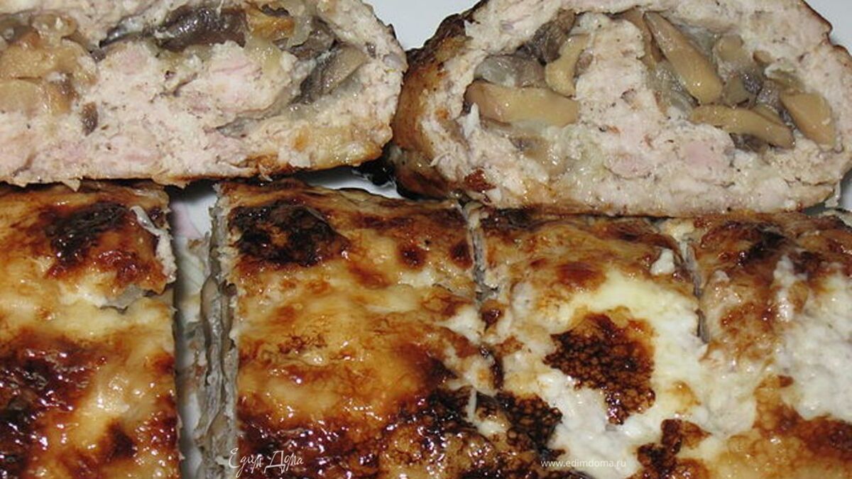 В фарш вмешать сырое яйцо и размоченные в молоке или воде ломтики батона( хлеба). Фарш хорошо выбить. Лук пожарить до золотистого цвета добавить грибы и жарить до испарения жидкости. Посолить. При желании - поперчить.Остудить до тёплого. Стол застелить пищевой плёнкой. На плёнку выложить мясной фарш и разровнять его в прямоугольник толщиной 1,5~2см.На мясной фарш выложить грибы. При помощи плёнки - приподнимая её с одного конца, - свернуть рулет , хорошенько обхлопать ладонями. Переложить на смазанный противень. Смазать сметаной или майонезом. Сделать несколько надрезов (это предохранит рулет от растрескивания). Поставить в духовку при t=200°С на 30-40 минут. Подавать рулет лучше в тёплом виде.