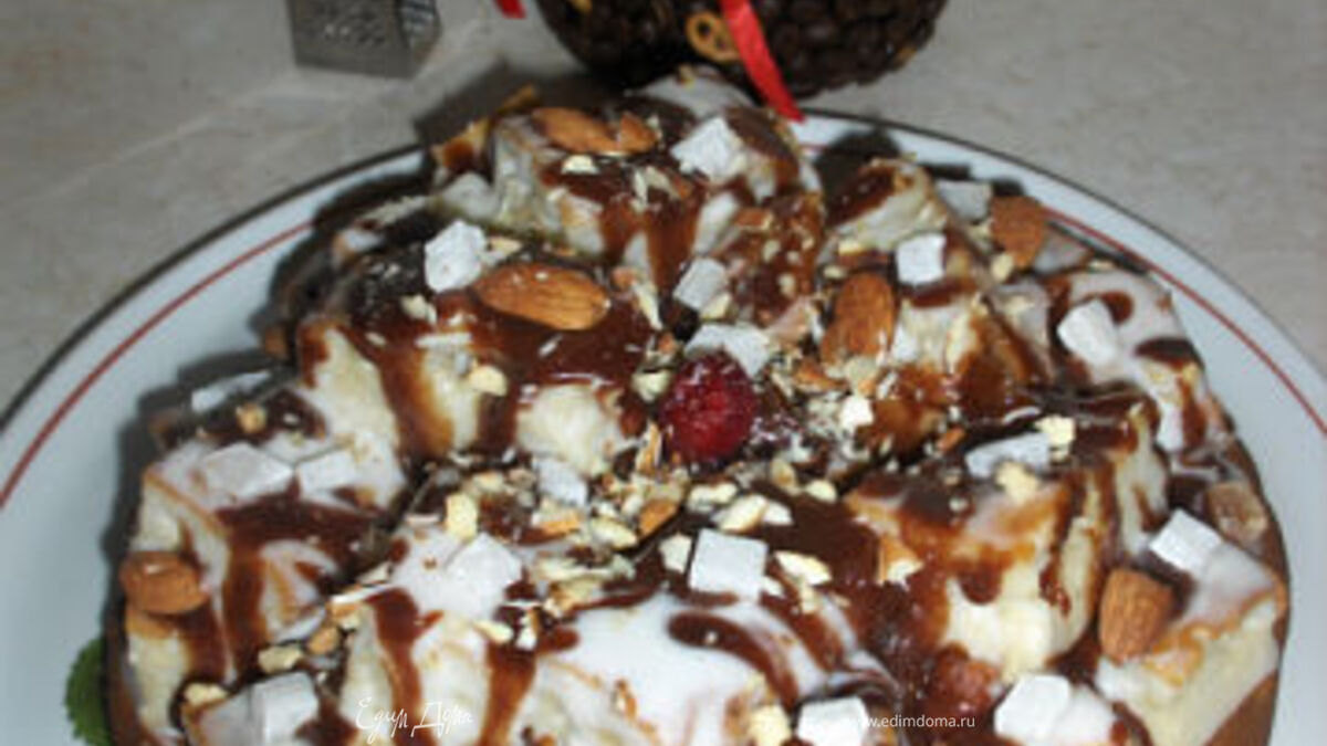 Смешать 2яйца,1стакан сметаны,1стакан сахара,0,5ч.л.соды гашёной,1стакан муки. Тесто разделить на 2 части. В одну часть добавить 3 ст.л.какао. Выпечь два коржа. Крем: 2стакана сметаны,1стакан сахара, ванилин - всё взбить венчиком. Один корж (или белый, или с какао)смазать кремом, другой корж порезать на кубики. После каждый кубик хорошо обмакнуть в крем и положить на круглый корж. И так все остальные кубики. Украсить орехами и цукатами. А затем варю глазурь и поливаю сверху тортик.