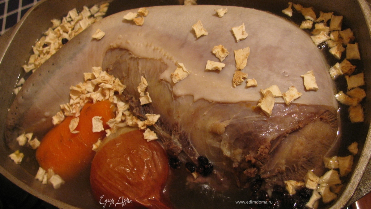 Тщательно промытый язык заливаем холодной водой и доводим до кипения. Кипятим несколько минут, пока не начнёт подниматься шапкой пена. - Шаг 2Подготовим пока, между делом, «дополнения» - традиционно это морковка, луковица, корень петрушки и сельдерея, лавровый лист и перец горошком и, разумеется, столовая ложка морской или обычной соли. Можно остановиться на этом составе специй приправ, а можно дополнить, например, сушеными ягодами можжевельника и барбариса или другими специями – вариантов много. Морковку чистим, с луковицы снимаем только верхний слой шелухи и срезаем немного там, где корень, после чего тщательно промываем её.