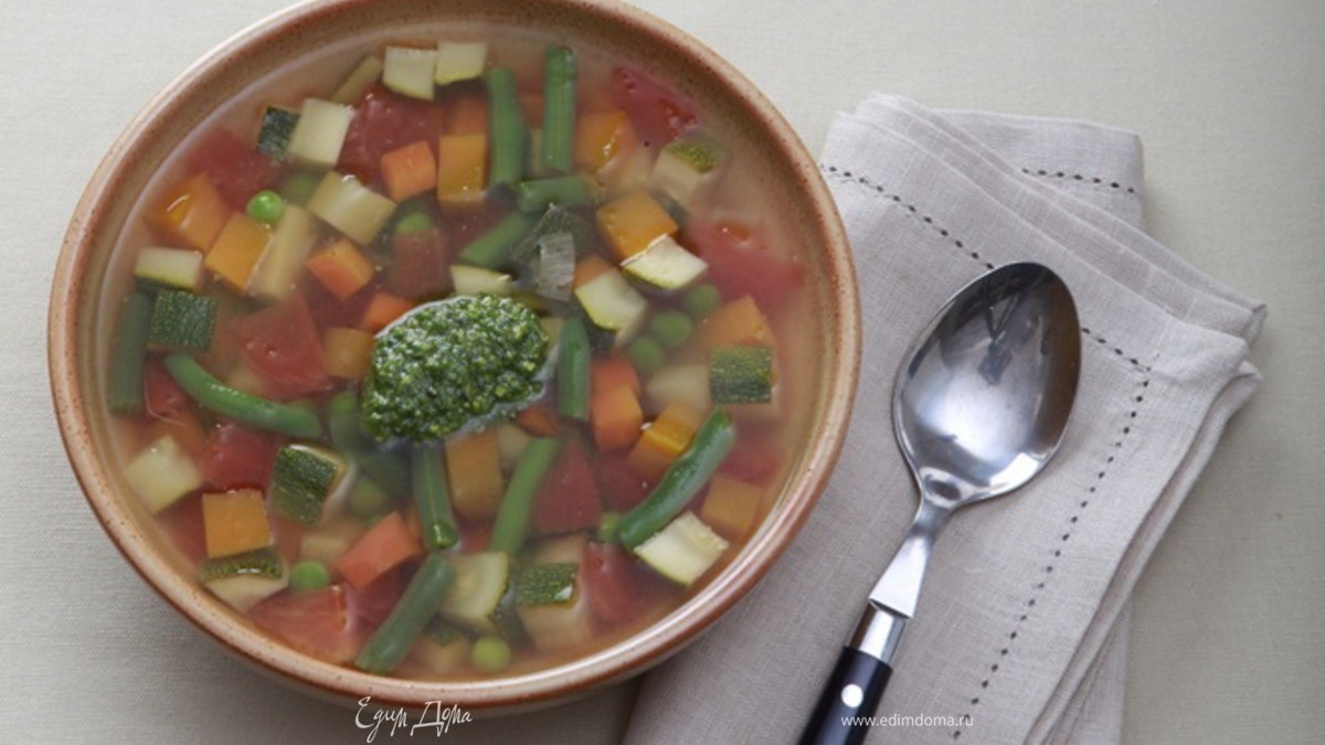 - Шаг 4Затем добавить зеленый горошек, варить суп еще 4–5 минут. Вынуть букет гарни. Суп разлить по тарелкам, в каждую положить по столовой ложке с горкой соуса писту.
