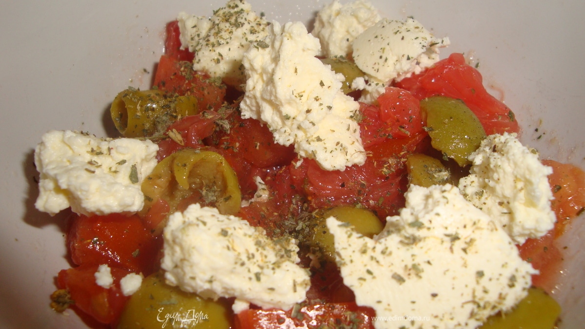 - Шаг 3теперь нарезать брынзу кусочками. залить все заправкой и перемешать. дать постоять еще минут 15, чтобы все запахи подружились. если не любите, когда сок стекший - подавайте сразу. приятного аппетита