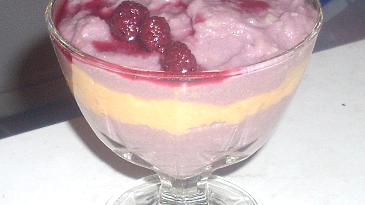 - Шаг 1В молоко добавляем масло, мед и немного соли, доводим до кипения. Помешиваем венчиком, добавляем манную крупу. Варим 10 минут. Снимаем с огня и оставляем под крышкой на 20-30 минут. В кашу добавляем желтки, перемешиваем. Затем вливаем белки. Делим кашу на две половины: в одну добавляем морковный сок, в другую - малиновый сироп/варенье. Укладываем в креманку, пиалу или стакан. Украшаем по вкусу.