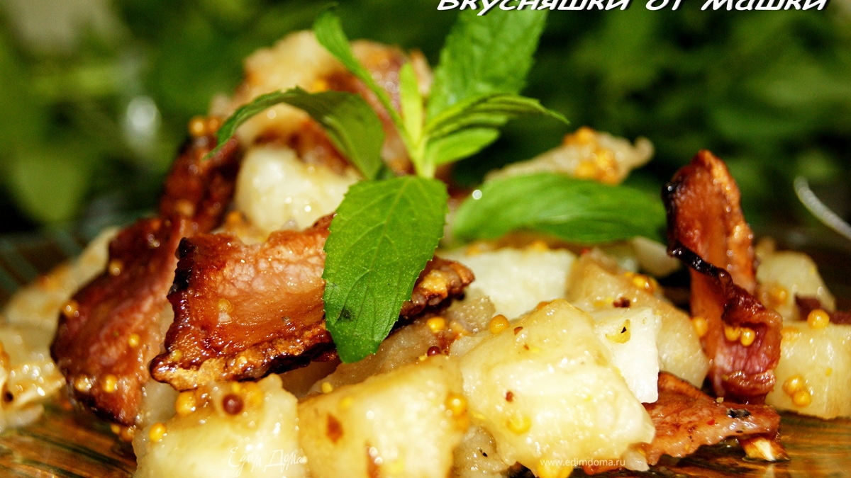 Обжариваем бекон на масле до хрустящей корочки, выкладываем на бумажное полотенце, чтоб стек лишний жир. В этой же сковороде обжариваем порезанный полукольцами лук и мелко нарезанный чеснок до золотого. Отвариваем целую картошку, остужаем, режем ее на кубики. Делаем заправку: Смешиваем 1 ст ложку бальзамического уксуса, 2 ст ложки горчицы, 2 ст ложки оливкового масла, соль, перец. В салатник выкладываем порезанную кубиками картошку, добавляем обжаренные лук и чеснок, ломтики бекона, заливаем заправкой и аккуратно перемешиваем. Добавляем зелень по вкусу. Есть можно как теплым, так и холодным.
