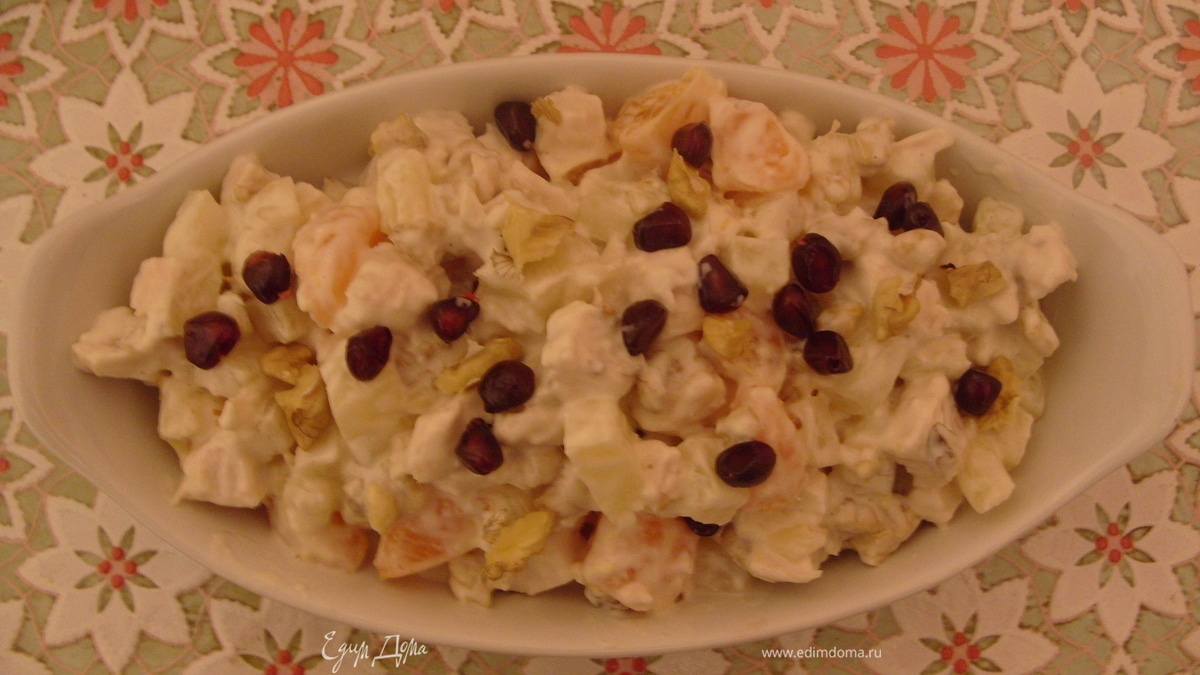 Покрошить руками грецкий орех (но не слишком мелко) и чуть обжарить на сковороде. - Шаг 5Смешать куриное филе, ананасы, мандарины, грецкий орех, майонез. При желании можно украсить гранатом. Приятного аппетита!