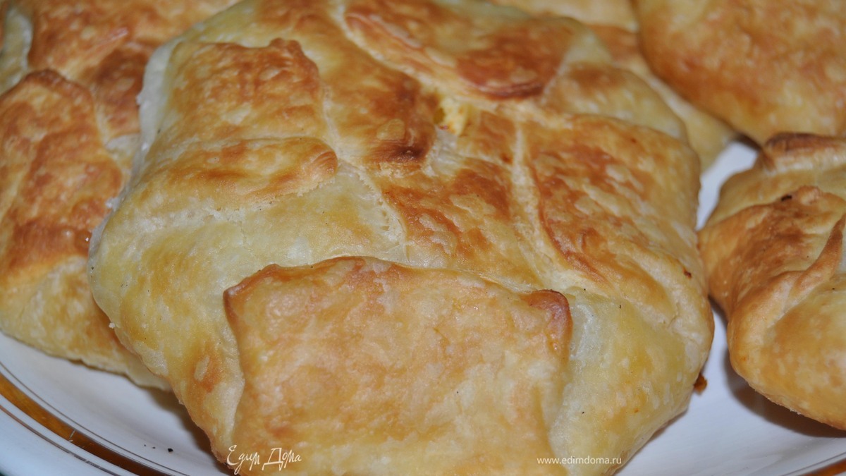Творог смешать с яйцом. Посолить так, чтобы творог был чуть солоноватый. Раскатать слоенное тесто толщиной 2-3мм.Разрезать на квадраты 15х15 см. В середину положить творог. - Шаг 2