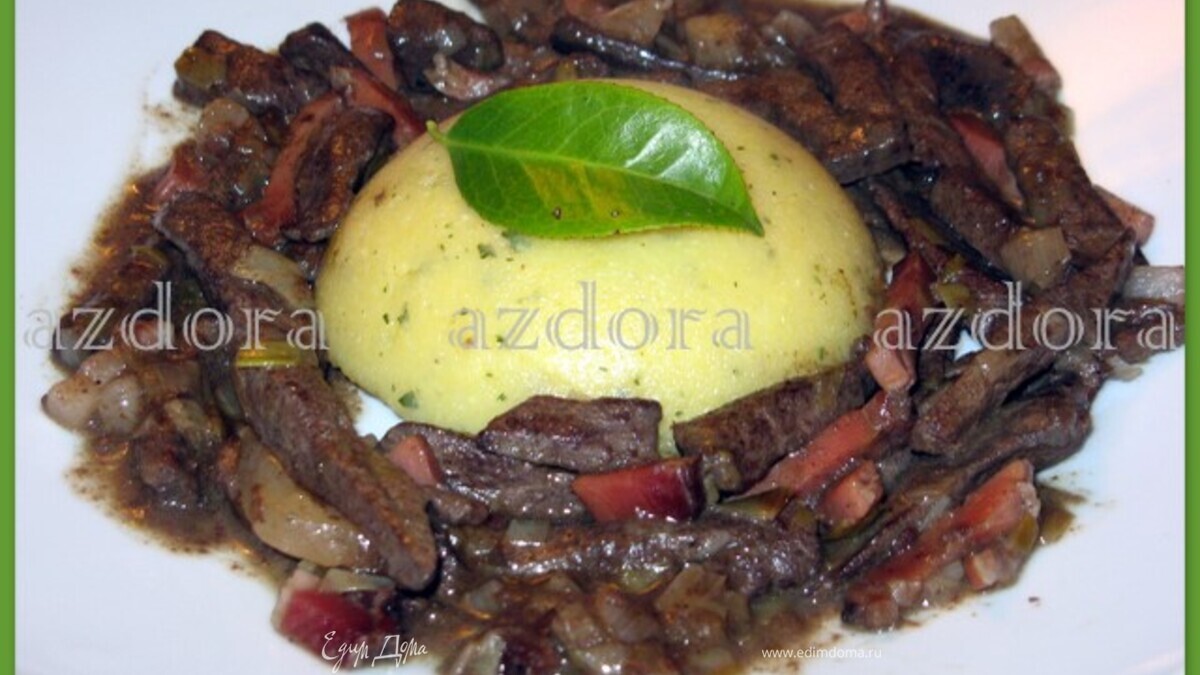 Добавить в получившийся соус печень, шпик и жареный лук. Посолить по вкусу, поперчить, добавить майоран и потушить всё вместе ещё минут 10. Подавать с полентой ( как на фото) или с картофельным пюре.