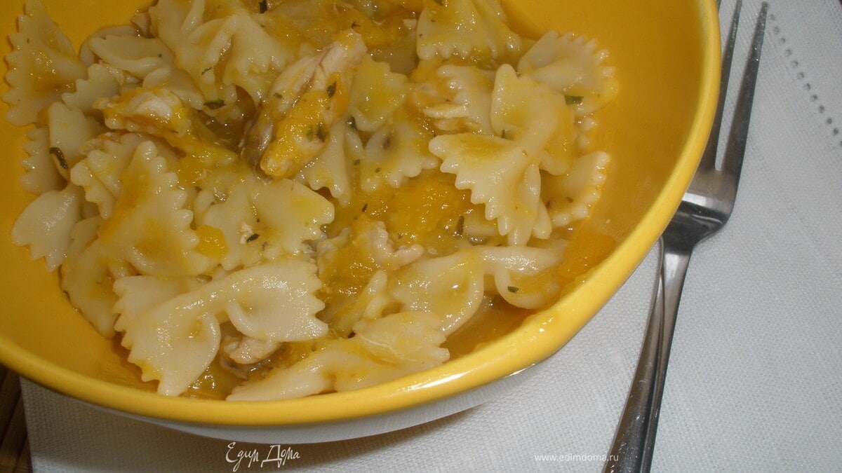 Отвариваем пасту (у меня "бантики") у Джейми тальятелли. На всякий случай необходимо оставить стакан воды с пасты, если тыква покажется суховатой. - Шаг 4