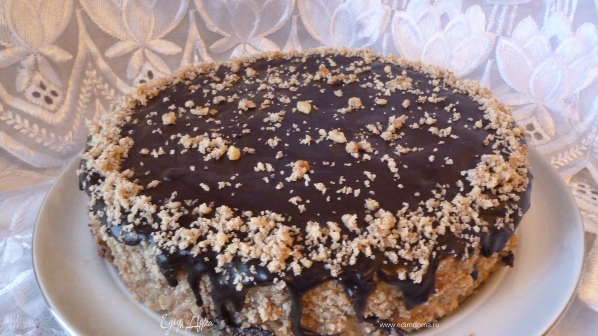 Достаем торт из холодильника,еще раз наносим крем на поверхность торта и на бока.Украшаем по своему усмотрению.Я обсыпала боковую поверхность молотыми орехами,а сверху нанесла шоколадную помадку.Отправим тортик обратно в холодильник,а утром достаем его,отрежем кусочек,наливаем чай или кофе и наслаждаемся...Приятного вам чаепития! - Шаг 18Шоколадная глазурь:Какао смешать с сахаром,добавить слегка подогретое молоко,перемешать и поставить на маленький огонь.Непрерывно помешивая нагреть до полного растворения сахара и добавить шоколад,вымешивать пока растворится шоколад и масса станет однородной и блестящей.Выключить огонь,добавить масло,хорошо размешать и добавить коньяк,перемешать,дать немного остыть и нанести на торт.