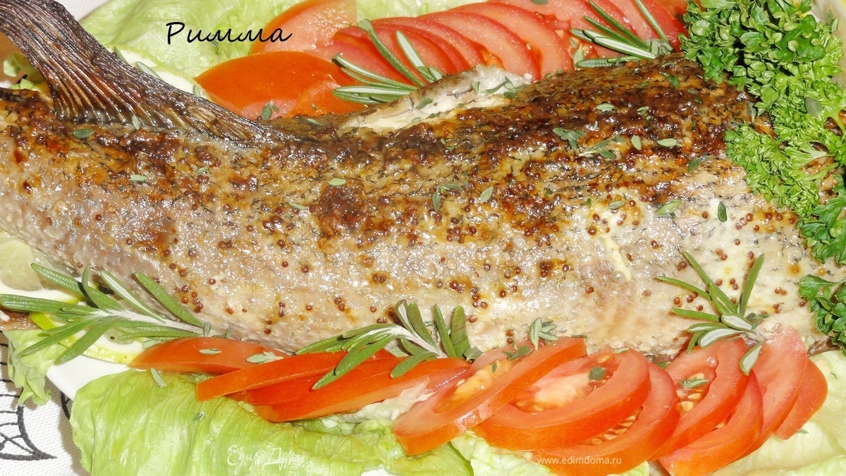 Смажьте тушку и голову рыбы смесью горчицы, майонеза и соком лимона. Переложите на противень и поставьте выпекать в духовке при температуре 180.