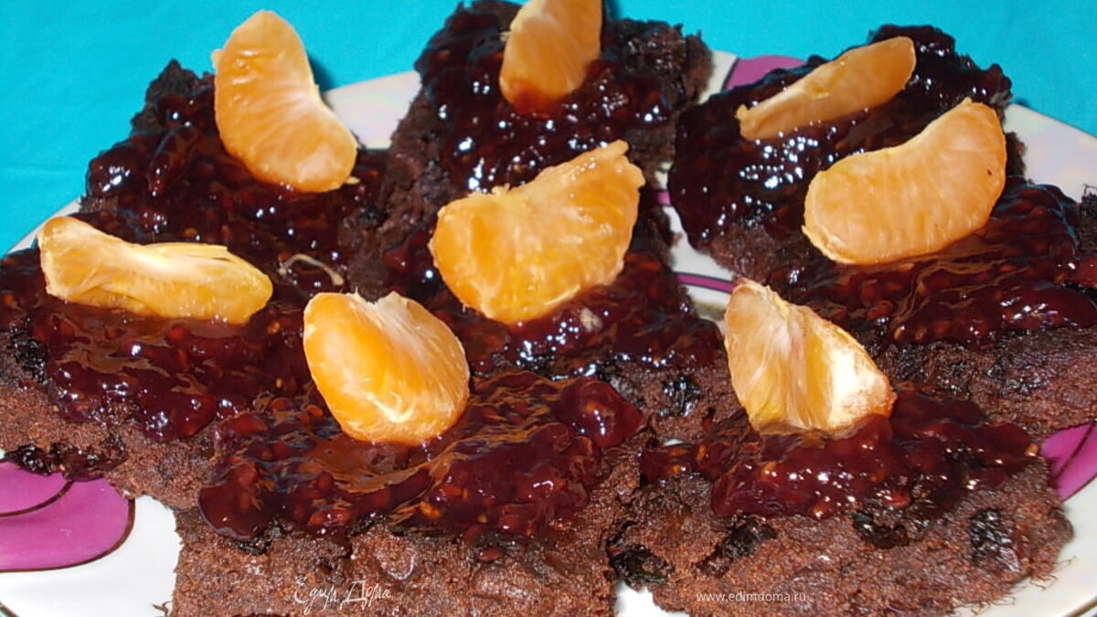 корж нарезать на прямоугольники или ромбики,верх смазать малиновым джемом и украсить дольками мандарина