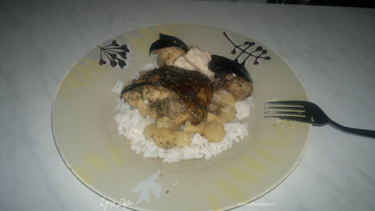 Сом из горшочка с рисом и сельдереем с лесными грибами