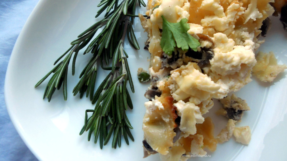 Фриттата с пастой, шампиньонами и фетой