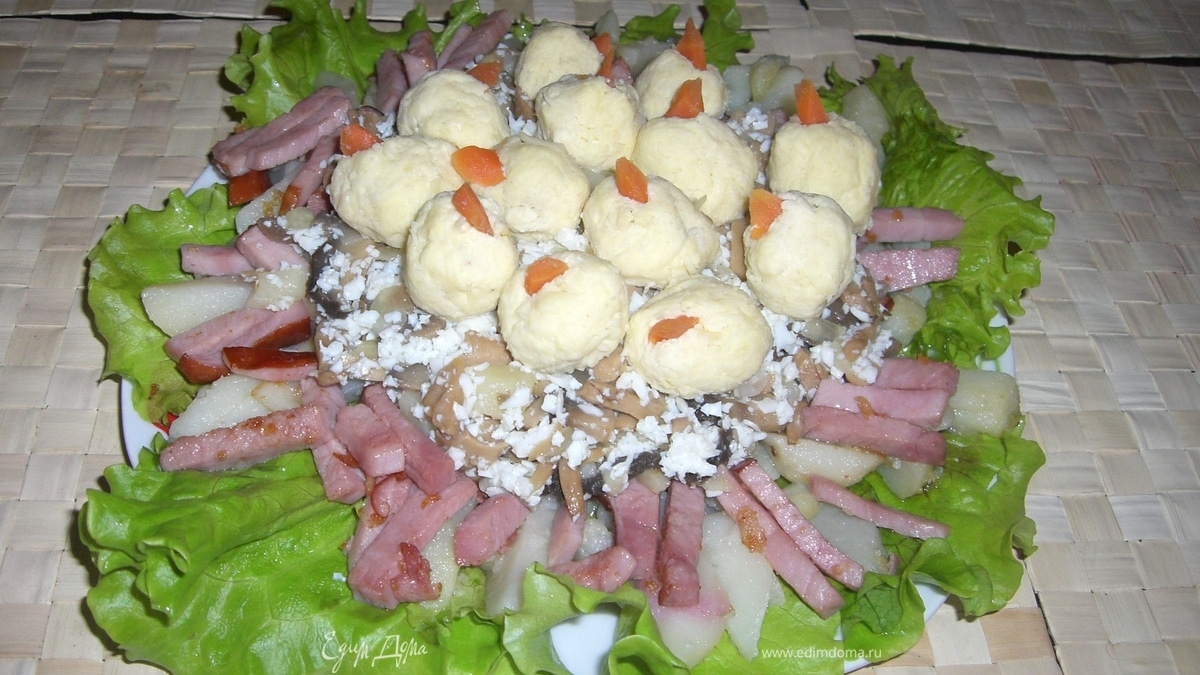 Картофель и капченное мясо выкладываем на листья салата в виде гнезда, добавляем туда лук с грибами и нарезанным белком. Вареную морковку охлаждаем и очищаем от кожуры. Скатываем небольшие шарики из сырно-чесночно-желтково-майонезной массы, в середину каждого из которых вкладываем половинку грецкого ореха. Теперь укладываем их в гнездо. - Шаг 4Все салат готов. Его лучше подавать теплым!