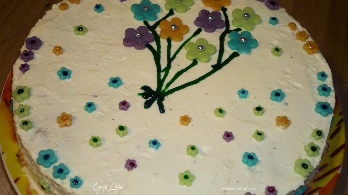 Украсить по вашему желанию. Я украсила цветочками из молочной мастики. И в холодильник на ночь, чтобы пропитался хорошенько. Приятного чаепития!!!