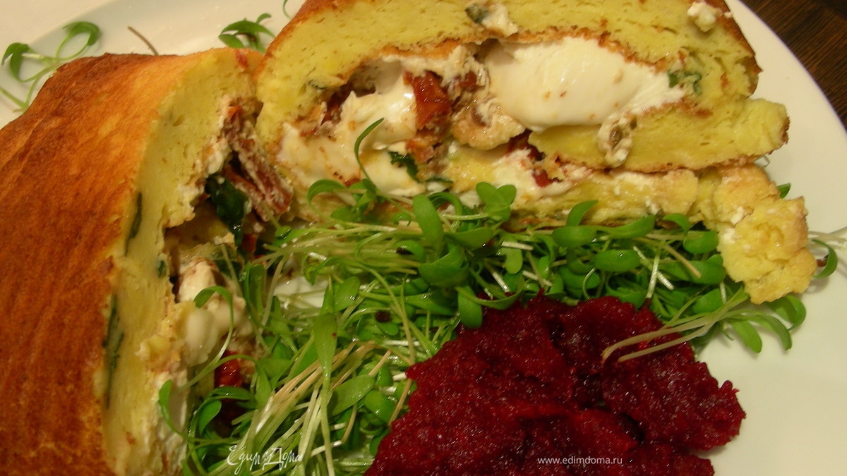 Воздушный рулет с рикоттой, козьим сыром, вялеными томатами и базиликом