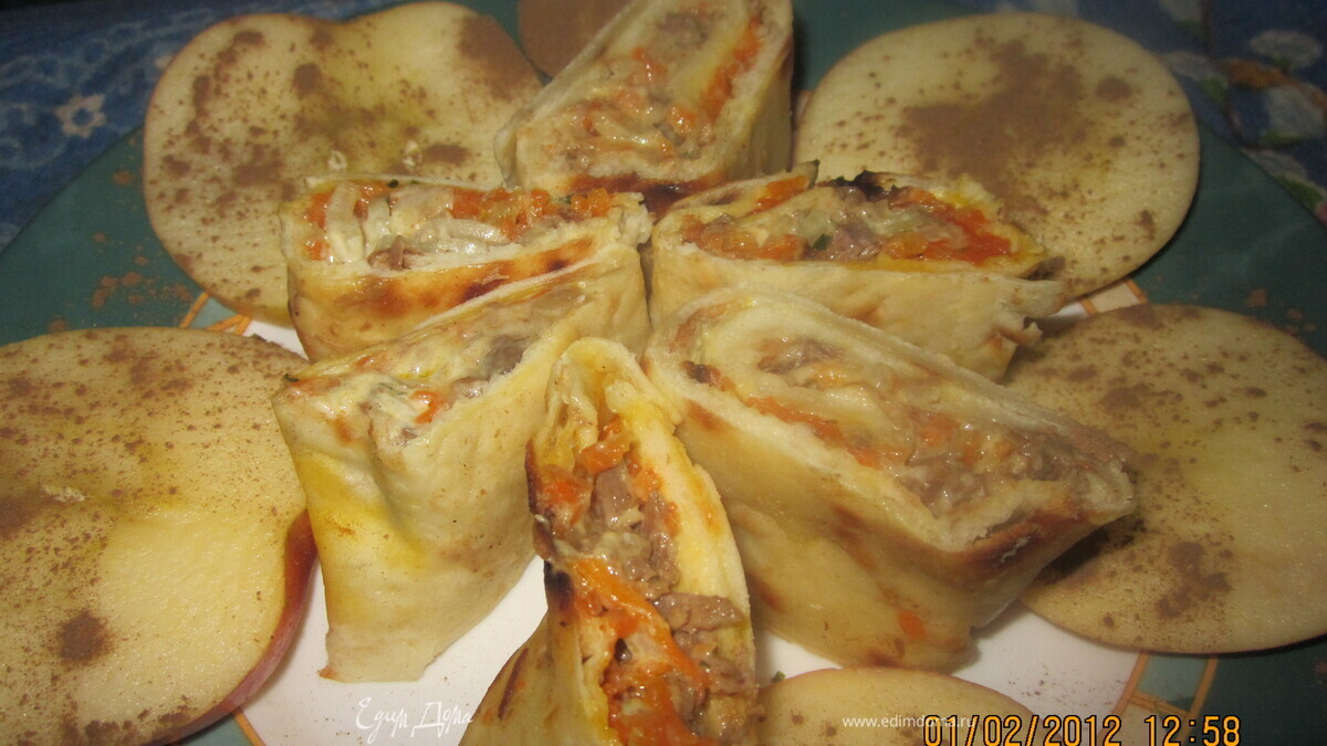 Испекли лепешки.Выкладываем поочередно по диаметру лаваша мясо,маринад,лук вместе с майонезом.Сверху присыпем тертым яблочком для придания пикантности и свежести.Завернем в трубочку.Так проделаем со всеми лепешками